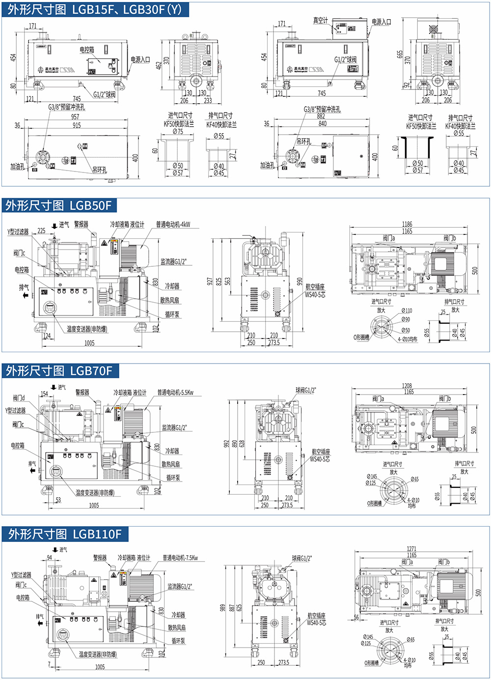 F系列風(fēng)冷干式螺桿真空泵不依賴(lài)外部循環(huán)水,通過(guò)自身獨特的風(fēng)冷降溫(LGB30F/LGB30FY)或冷凍液循環(huán)降溫(LGB70F/LGB110F)系統來(lái)完成熱量交換,保證了真空泵的可靠、長(cháng)期運行,是一次技術(shù)上的極大革新。